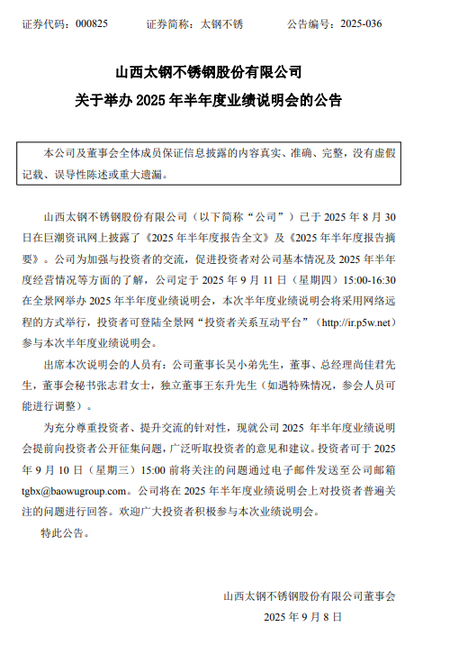 (來源:山西太鋼不銹鋼股份有限公司關于舉辦2025年半年度業績說明會的公告)