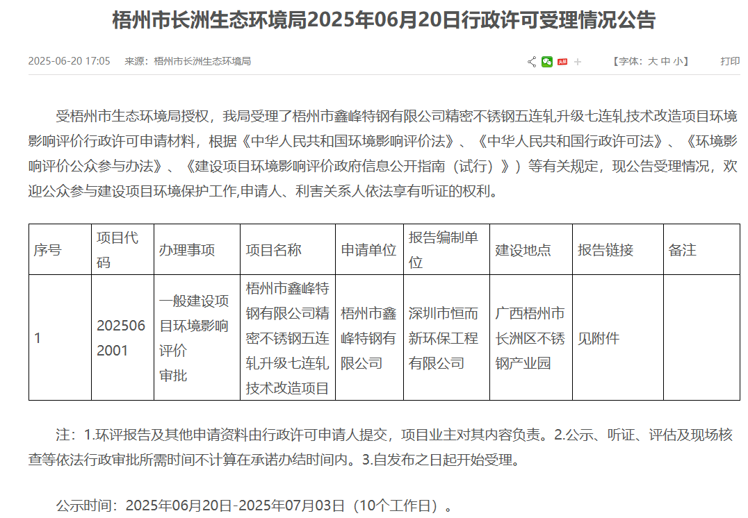 2025年6月20日,梧州市長洲生態環境局受理梧州市鑫峰特鋼有限公司精密不銹鋼五連軋升級七連軋技術改造項目環境影響評價行政許可申請材料并對外進行公示,公示時間:2025年06月20日-2025年07月03日(10個工作日)。