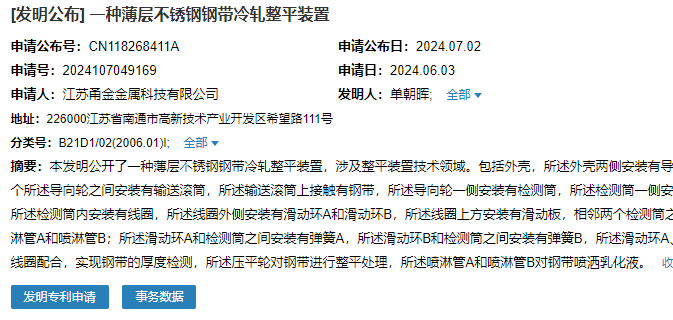 2024年7月2日,江蘇甬金金屬科技有限公司成功申請一項名為“一種薄層不銹鋼鋼帶冷軋整平裝置”專利,申請公布號CN118268411A,申請日期為2024年6月3日。