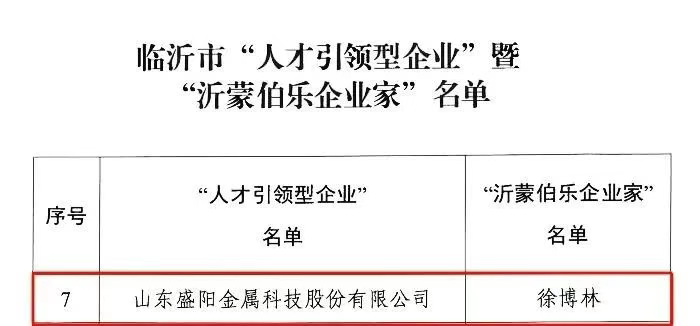 其中,山東盛陽(yáng)金屬科技被評(píng)選為“人才引領(lǐng)型企業(yè)”,集團(tuán)總裁徐博林被授予“沂蒙伯樂(lè)企業(yè)家”榮譽(yù)稱號(hào)。