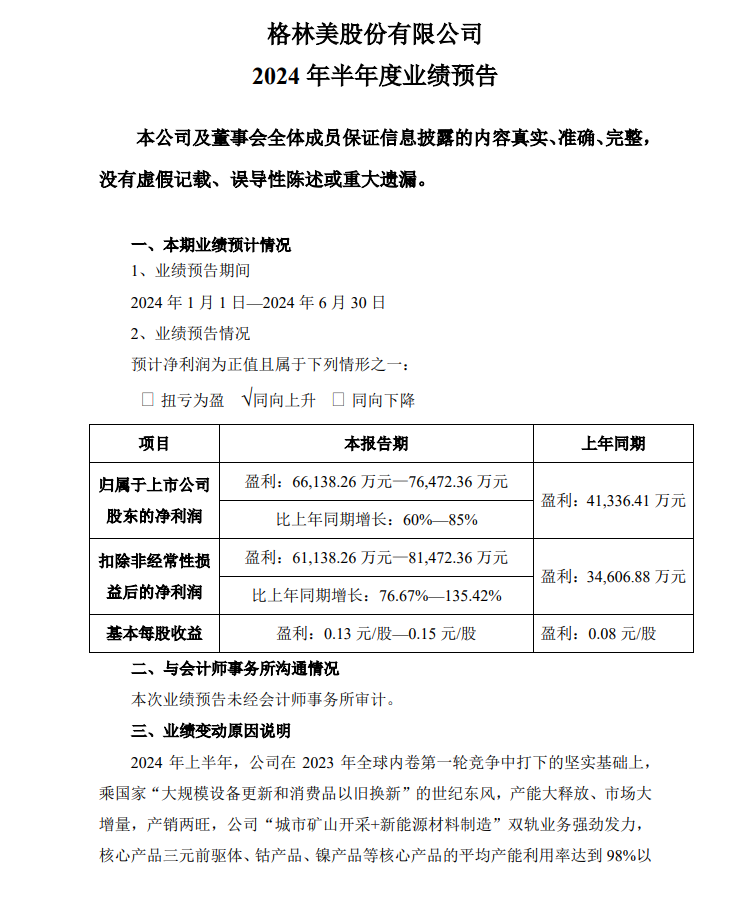 業績變動主要原因是,2024年上半年,公司在2023年全球內卷第一輪競爭中打下的堅實基礎上,乘國家“大規模設備更新和消費品以舊換新”的世紀東風,產能大釋放、市場大增量,產銷兩旺,公司“城市礦山開采+新能源材料制造”雙軌業務強勁發力,核心產品三元前驅體、鈷產品、鎳產品等核心產品的平均產能利用率達到98%以上,毛利率全面提升,大幅提升了盈利能力,各項業務全面進入盈利增量通道。